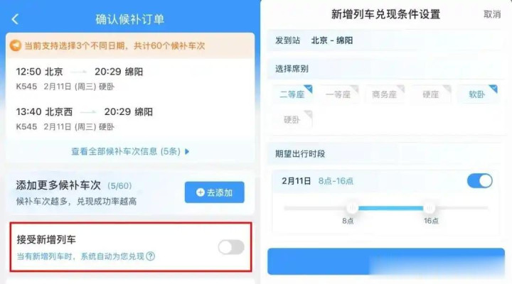 购票时,很多人还忽略了一项“隐藏福利”。在提交候补订单时,记得勾选 “接受新增列车” 选项。