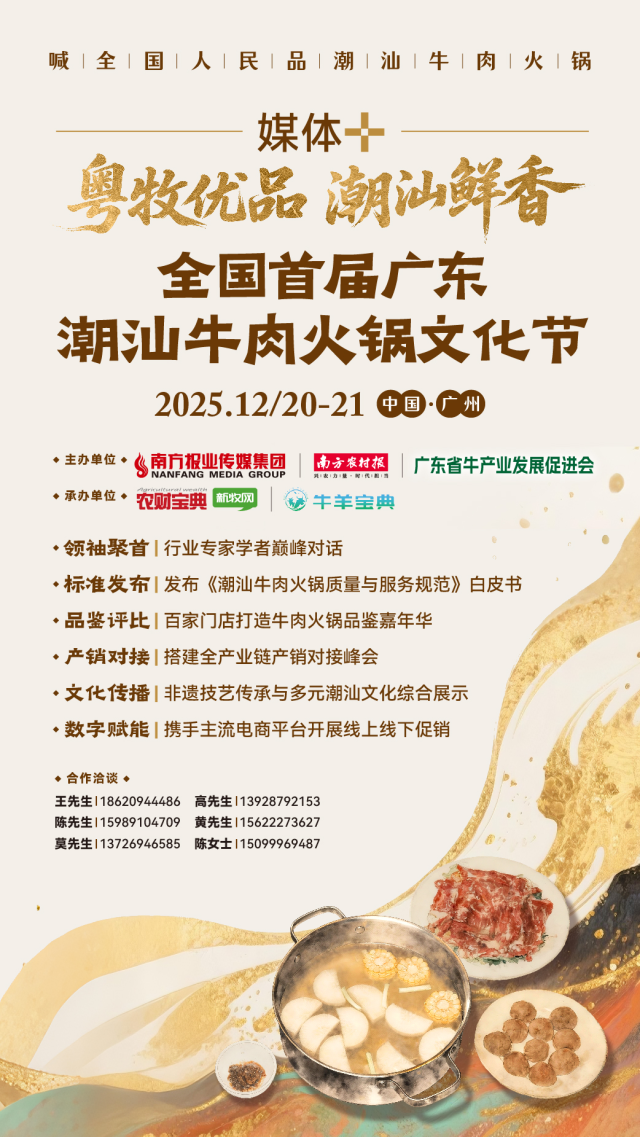 2025年12月,以“粤牧优品,潮汕鲜香——喊全国人民品潮汕牛肉火锅”为核心主题的全国首届广东潮汕牛肉火锅文化节,将在广州热力启幕。
