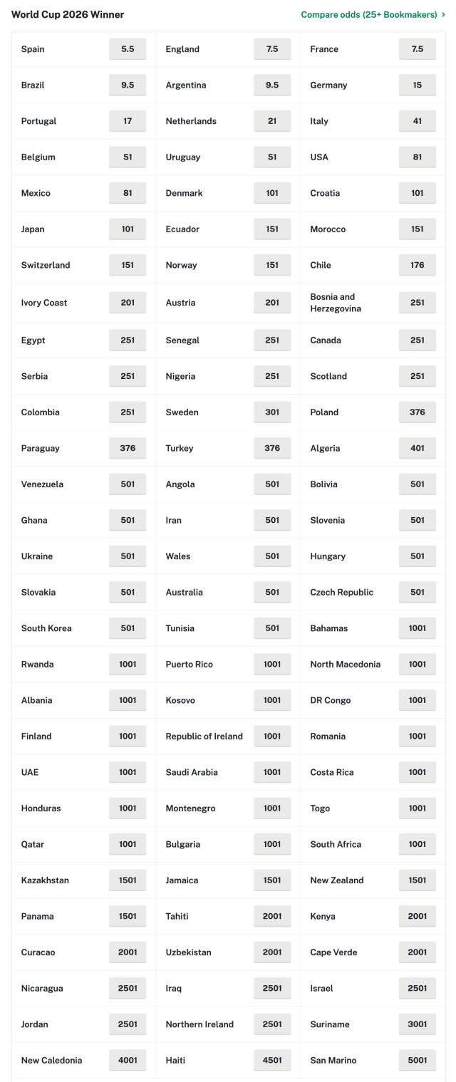 2026美加墨世界杯48个席位完成抽签,分组对阵出来后,博彩公司也第一时间开出了冠军和金靴等赔率。西班牙最被看好,英法次之,阿根廷和巴西再次之。值得一提的是,此前1970和1986两次墨西哥世界杯,冠军恰好就是巴西和阿根廷,而1994美国世界杯冠军是巴西。