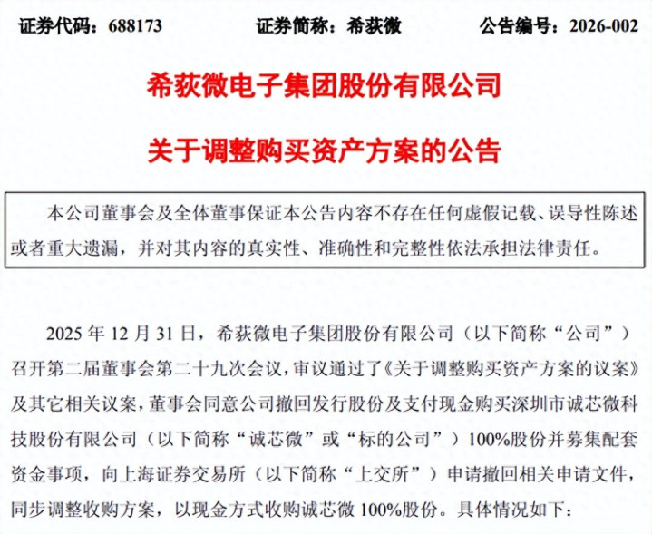 2026年1月1日,希荻微(688173)发布系列公告,宣布终止原筹划的发行股份及支付现金购买资产并募集配套资金事项,同时抛出全新收购方案,拟以3.1亿元现金全额收购深圳市诚芯微科技股份有限公司(下称“诚芯微”)100%股份。目前,公司已收到上海证券交易所终止相关审核的决定,这场历时一年多的重组事项正式转向现金收购赛道。