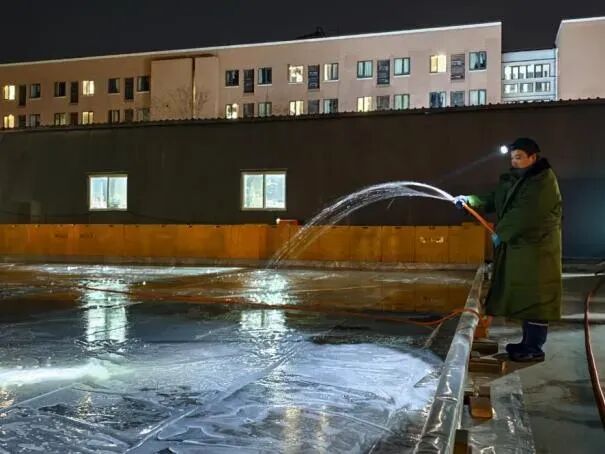随着冰场面积增加,造冰困难程度也相应提高。工作人员要在平整好的土地上,先用防水布铺底,再用挡水石搭起围挡,确保浇水时不会渗漏。由于白天气温较高,学校晚上还需安排多名工作人员轮流进行浇水造冰。