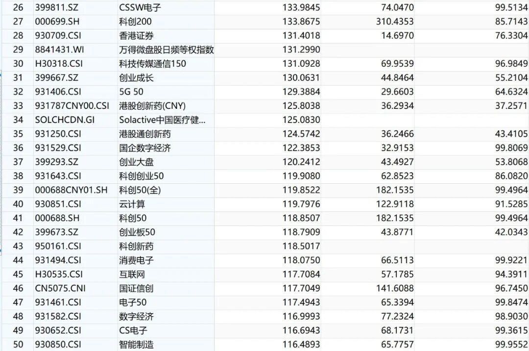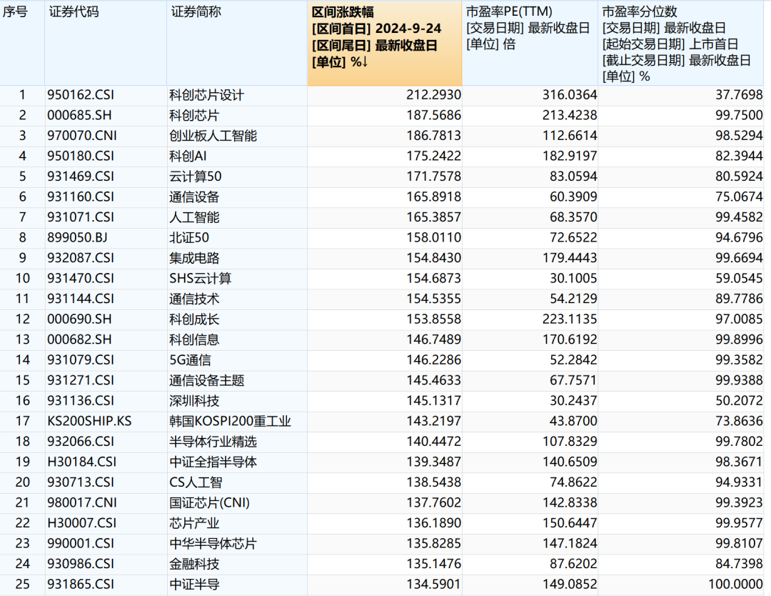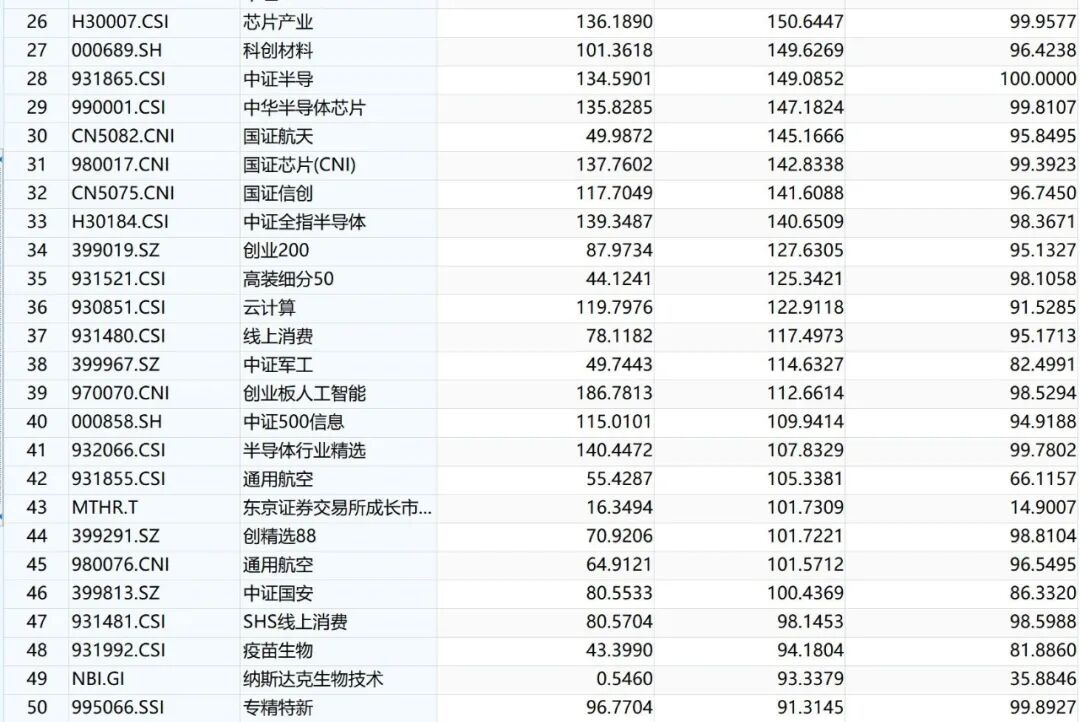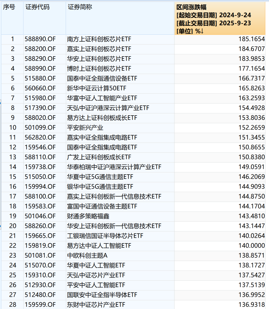 进一步分赛道看,市场可交易指数涨幅TOP 50基本都是芯片、AI、云计算、通信等,其中科创芯片设计指数增长212.29%,为涨幅第一!北证50上涨158.01%,为前20中唯一的宽基指数。(截至2025年9月23日)