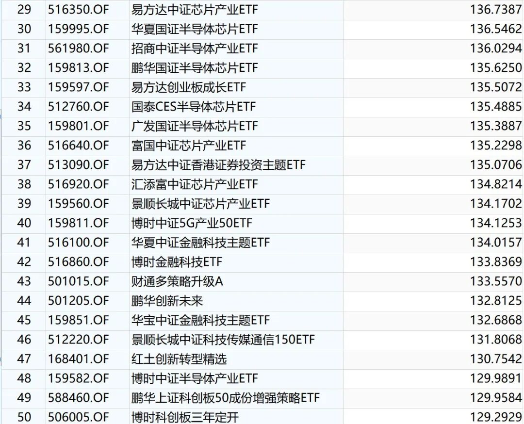 具体到基金产品,近1年基金涨幅TOP 50的产品基本都被ETF基金霸屏,且和市场可交易指数涨幅TOP 50 有高关联性,基本都是芯片、云计算、科创、通信类ETF基金。