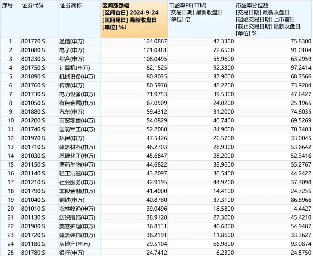 分行业来看,申万一级行业指数在过去1年里全部上涨,其中,科技板块领涨,通信、电子和计算机三大行业涨幅居前,涨幅分别为124.08%、121.05%、82.15%。(截至2025年9月23日)