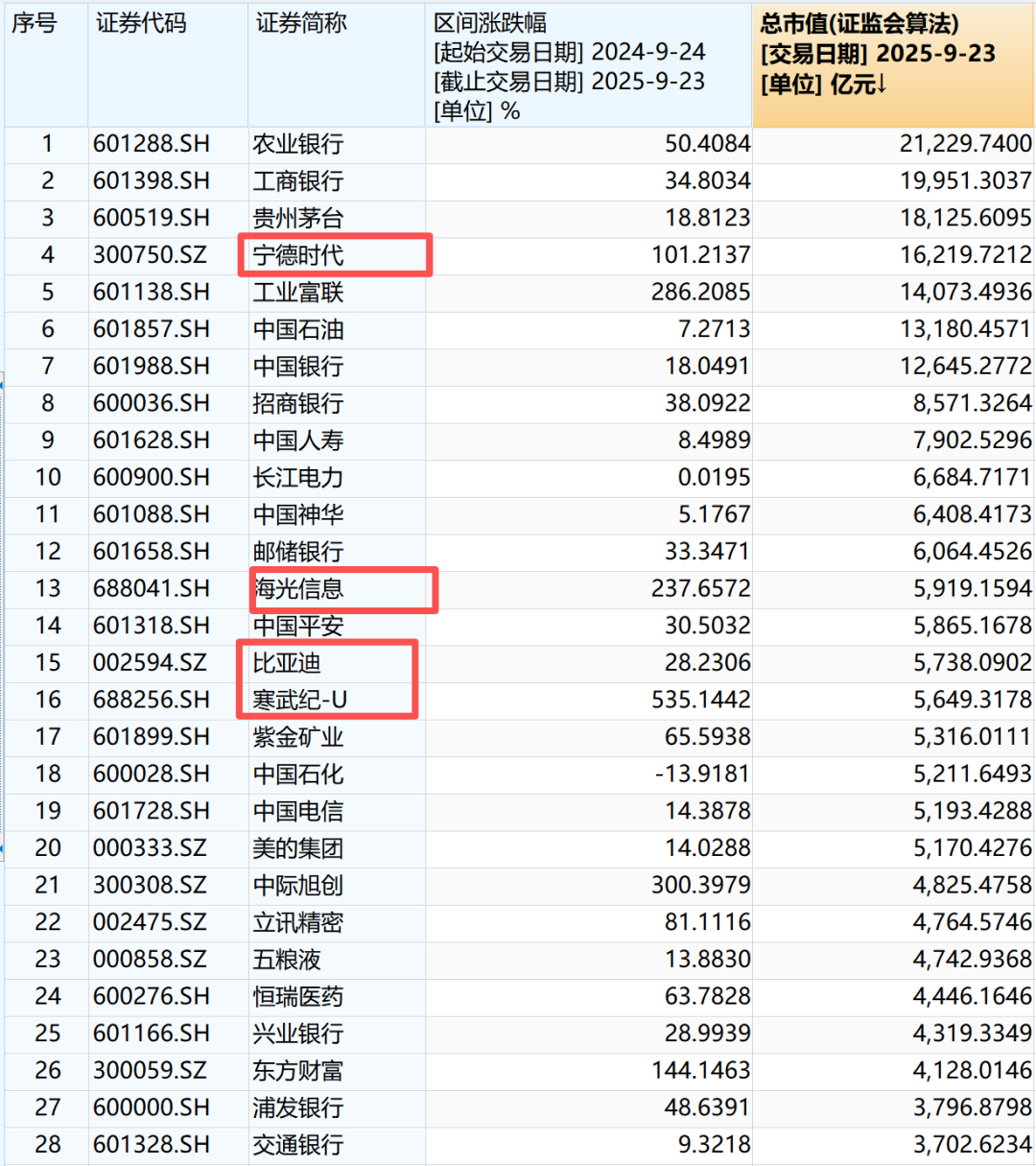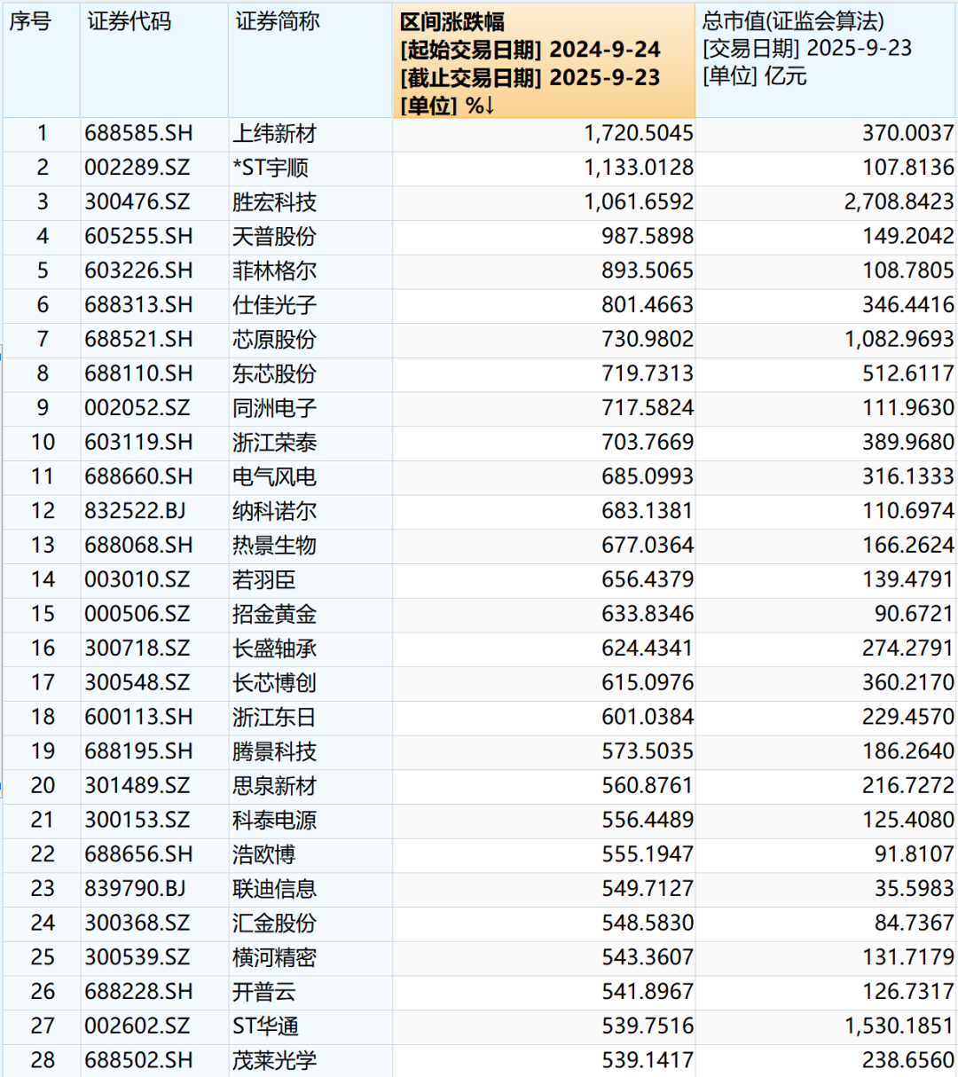 ]article_adlist-->过去一年间,A股总市值从2024年9月24日的70.6万亿元增长至2025年9月23日的103.87万亿元,涨幅为47.1%。